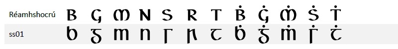 Tá na leaganacha inseacha de roinnt litreacha ('b', 'g', 'm', 'n', 'r', 's' agus 't') le fáil mar mhalairtí stíle (stylistic alternates). Lena n‑úsáid, roghnaigh stylistic set 1: