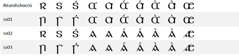Tá na leaganacha inseacha de 'r', 's' agus 'ṡ' le fáil mar mhalairtí stíle (stylistic alternates) i gCaolchló GC. Lena n‑úsáid, roghnaigh stylistic set 1. Chun leaganacha malartacha de na litreacha 'a' agus 'æ' a fháil, roghnaigh stylistic set 2. Tá na leaganacha malartacha céanna le fáil, in éineacht leis na leaganacha inseacha de 'r' agus 's', in stylistic set 3.