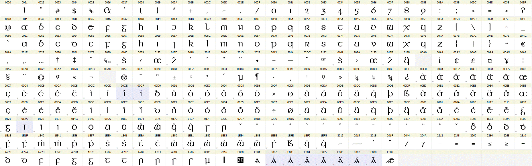 Tá Caolchló GC códaithe de réir Unicode, an caighdeán idirnáisiúnta, agus tá na carachtair go léir ann léirithe anseo. Is féidir sampla de théacs a clóbhuaileadh leis an gcló seo a léamh má tá Acrobat Reader ar do ríomhaire agat.