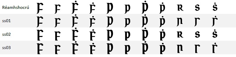 Tá na leaganacha inseacha de 'r' agus de 's' le fáil mar mhalairtí stíle (stylistic alternates) sa chló; lena n‑úsáid, roghnaigh stylistic set 1.