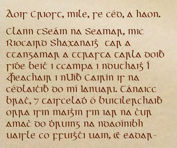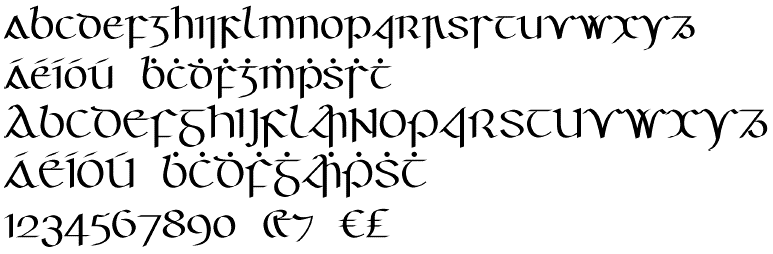 Tá an cló seo códaithe de réir Unicode, an caighdeán idirnáisiúnta, agus tá na carachtair go léir ann léirithe anseo. Is féidir sampla de théacs a clóbhuaileadh leis an gcló seo a léamh má tá Acrobat Reader ar do ríomhaire agat.