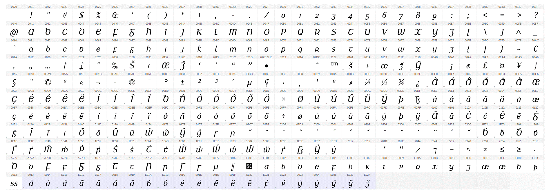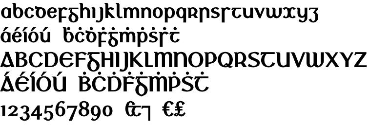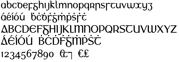 Tá an cló seo códaithe de réir Unicode, an caighdeán idirnáisiúnta, agus tá na carachtair go léir ann léirithe anseo. Is féidir sampla de théacs a clóbhuaileadh leis an gcló seo a léamh má tá Acrobat Reader ar do ríomhaire agat.
