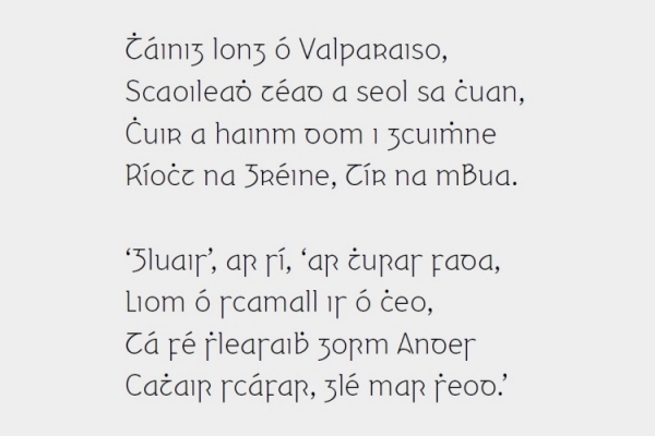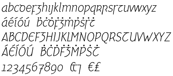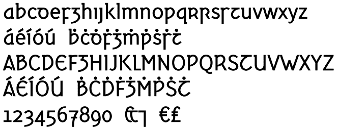 Tá an cló seo códaithe de réir Unicode, an caighdeán idirnáisiúnta, agus tá na carachtair go léir ann léirithe anseo. Is féidir sampla de théacs a clóbhuaileadh leis an gcló seo a léamh má tá Acrobat Reader ar do ríomhaire agat.