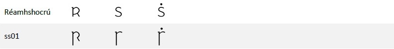 Tá na leaganacha inseacha de 'r' agus de 's' le fáil mar mhalairtí stíle (stylistic alternates) i leagan 4.000 den chló. Lena n‑úsáid, roghnaigh stylistic set 1: