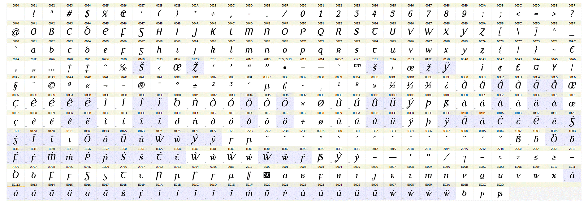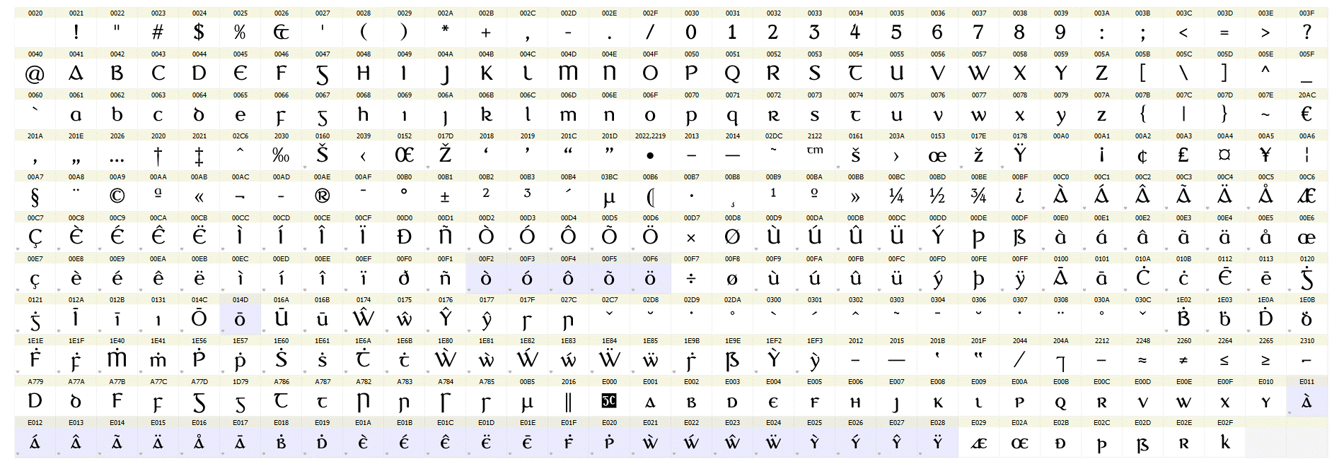 Tá an cló seo códaithe de réir Unicode, an caighdeán idirnáisiúnta, agus tá na carachtair go léir ann léirithe anseo. Is féidir sampla de théacs a clóbhuaileadh leis an gcló seo a léamh má tá Acrobat Reader ar do ríomhaire agat.