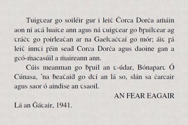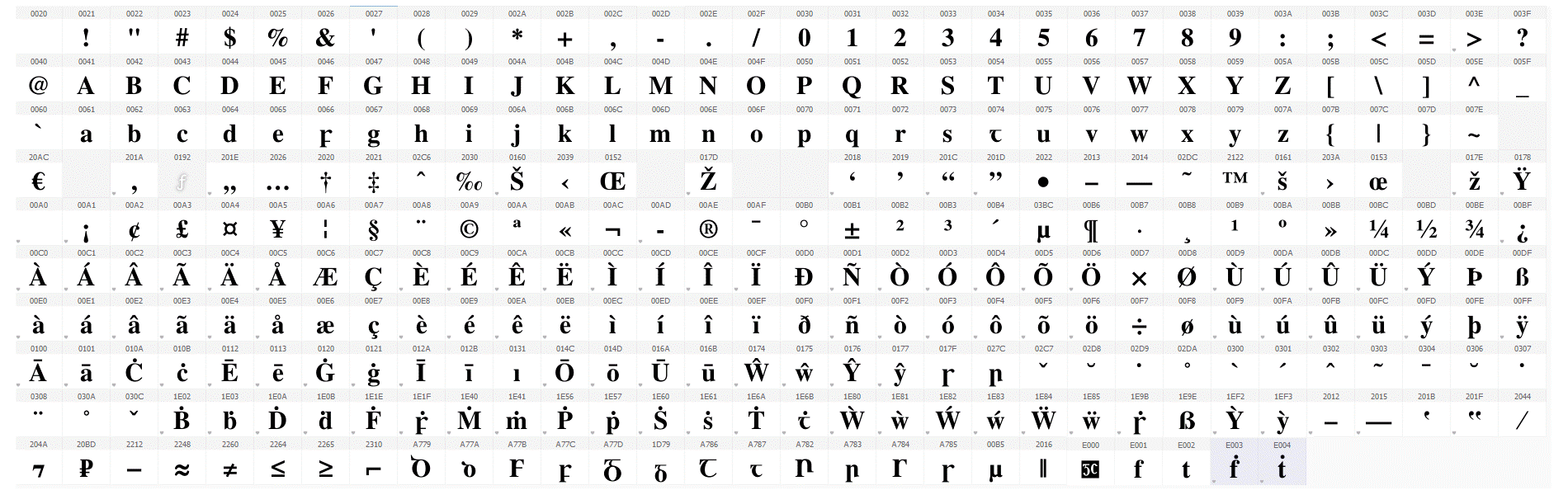 Tá an cló seo códaithe de réir Unicode, an caighdeán idirnáisiúnta, agus tá na carachtair go léir ann léirithe anseo. Is féidir sampla de théacs a clóbhuaileadh leis an gcló seo a léamh má tá Acrobat Reader ar do ríomhaire agat.