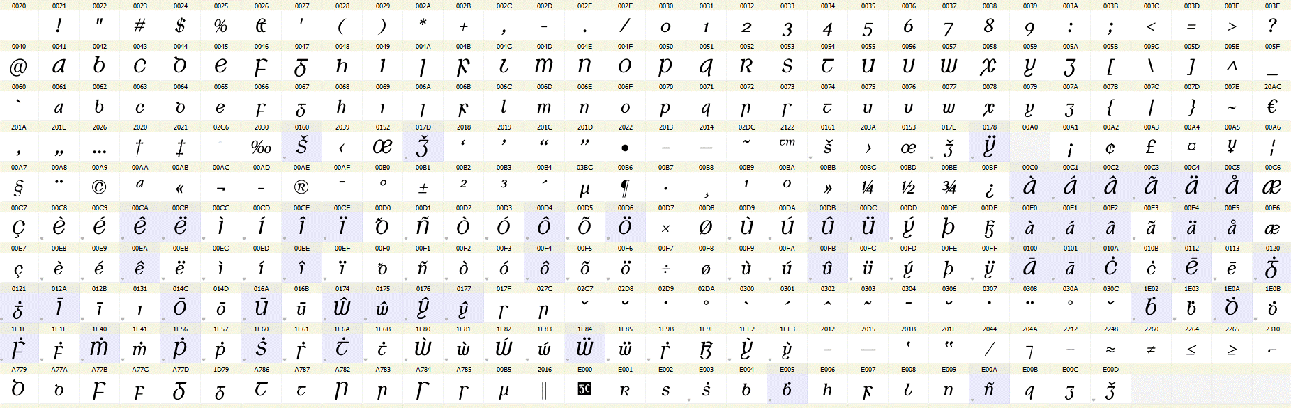 Tá Ríchló Iodálach GC códaithe de réir Unicode, an caighdeán idirnáisiúnta, agus tá na carachtair go léir ann léirithe anseo. Is féidir sampla de théacs a clóbhuaileadh leis an gcló seo a léamh má tá Acrobat Reader ar do ríomhaire agat.