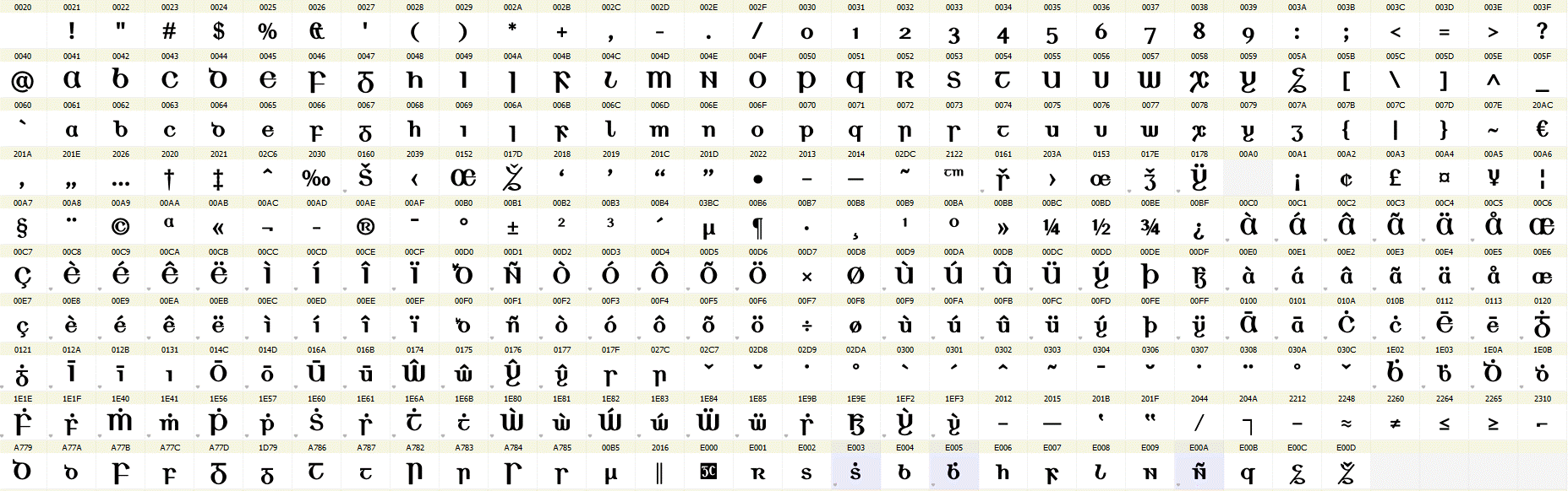 Tá Ríchló Trom GC códaithe de réir Unicode, an caighdeán idirnáisiúnta, agus tá na carachtair go léir ann léirithe anseo. Is féidir sampla de théacs a clóbhuaileadh leis an gcló seo a léamh má tá Acrobat Reader ar do ríomhaire agat.