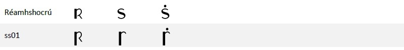 Tá na leaganacha inseacha de 'r' agus de 's' le fáil mar mhalairtí stíle (stylistic alternates) i leagan 3.00 den chló. Lena n‑úsáid, roghnaigh stylistic set 1: