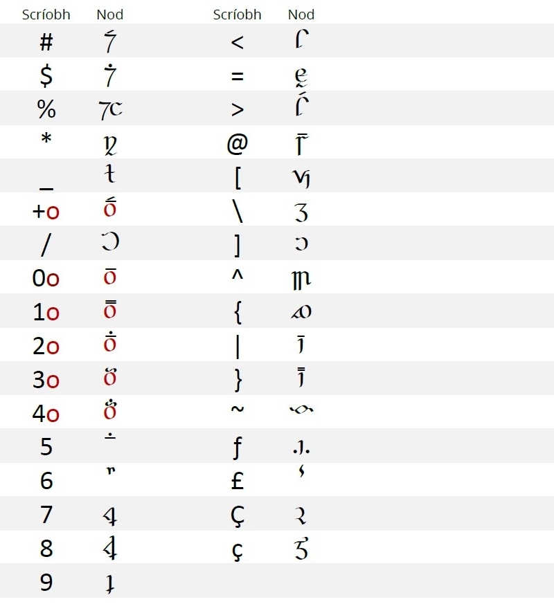 Taispeántar conas gach nod a scríobh anseo thíos (seasann "o" dearg do litir ar bith).