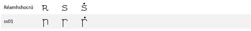 Tá na leaganacha inseacha de 'r' agus de 's' le fáil mar mhalairtí stíle (stylistic alternates) i leagan 7.00 den chló. Lena n‑úsáid, roghnaigh stylistic set 1: