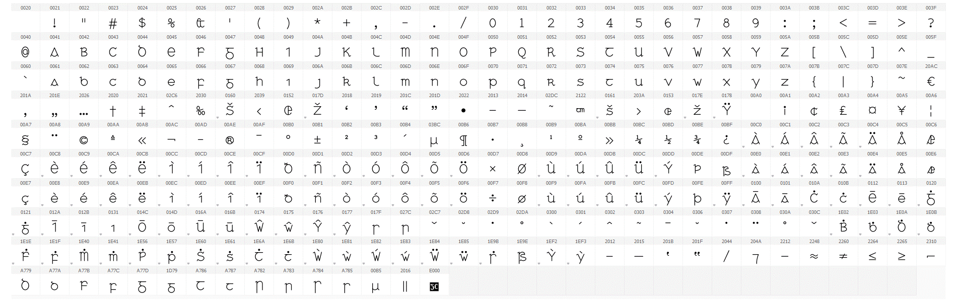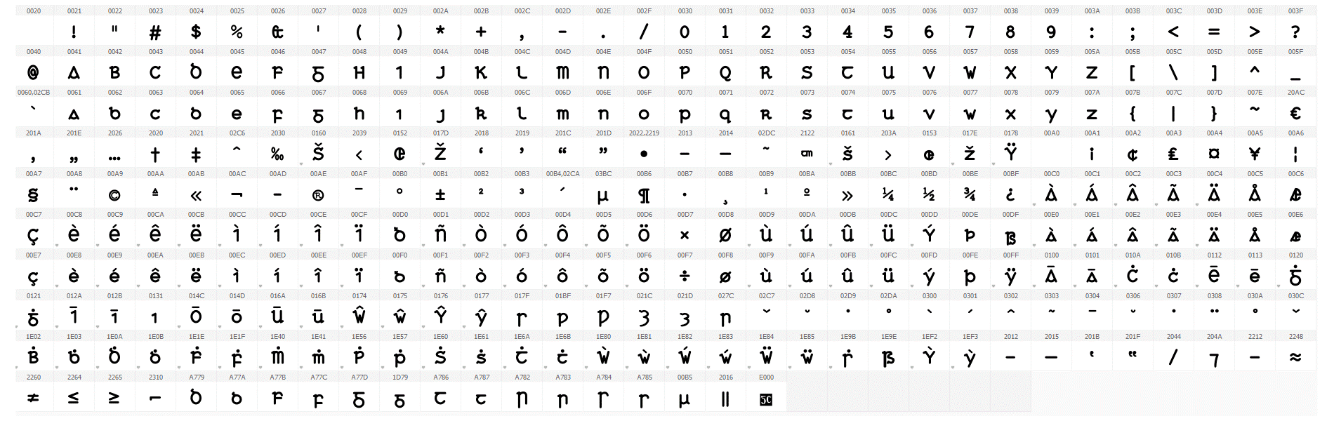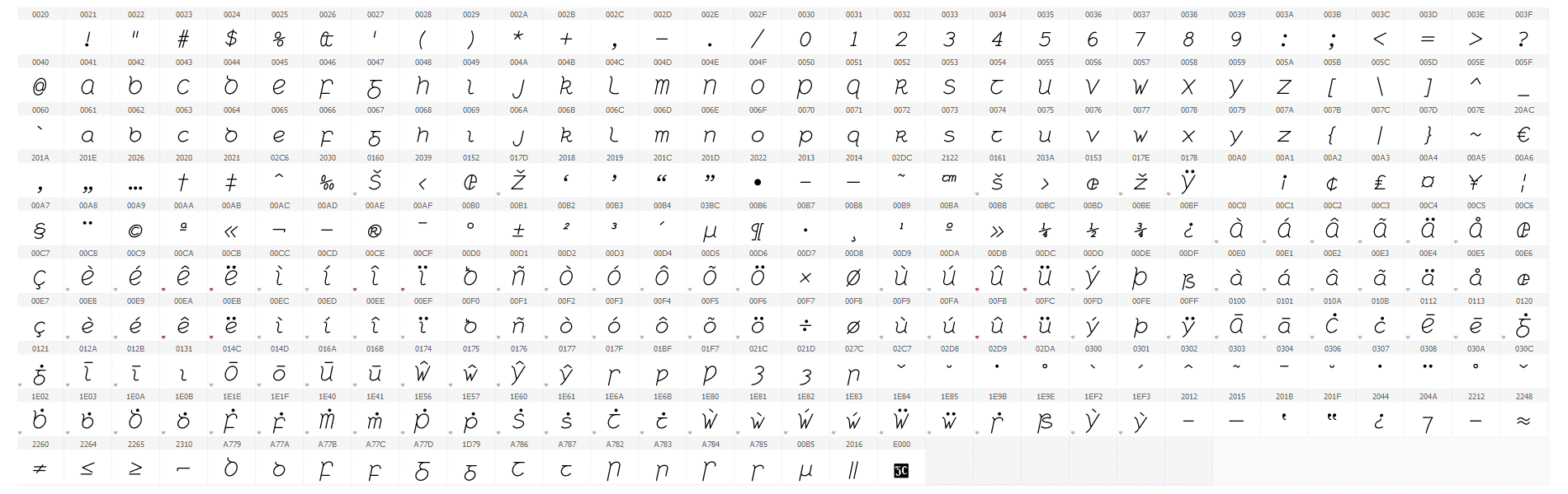 Tá an cló seo códaithe de réir Unicode, an caighdeán idirnáisiúnta, agus tá na carachtair go léir ann léirithe anseo. Tá sampla de théacs a clóbhuaileadh leis an gcló seo le léamh anseo má tá Acrobat Reader ar do ríomhaire agat.