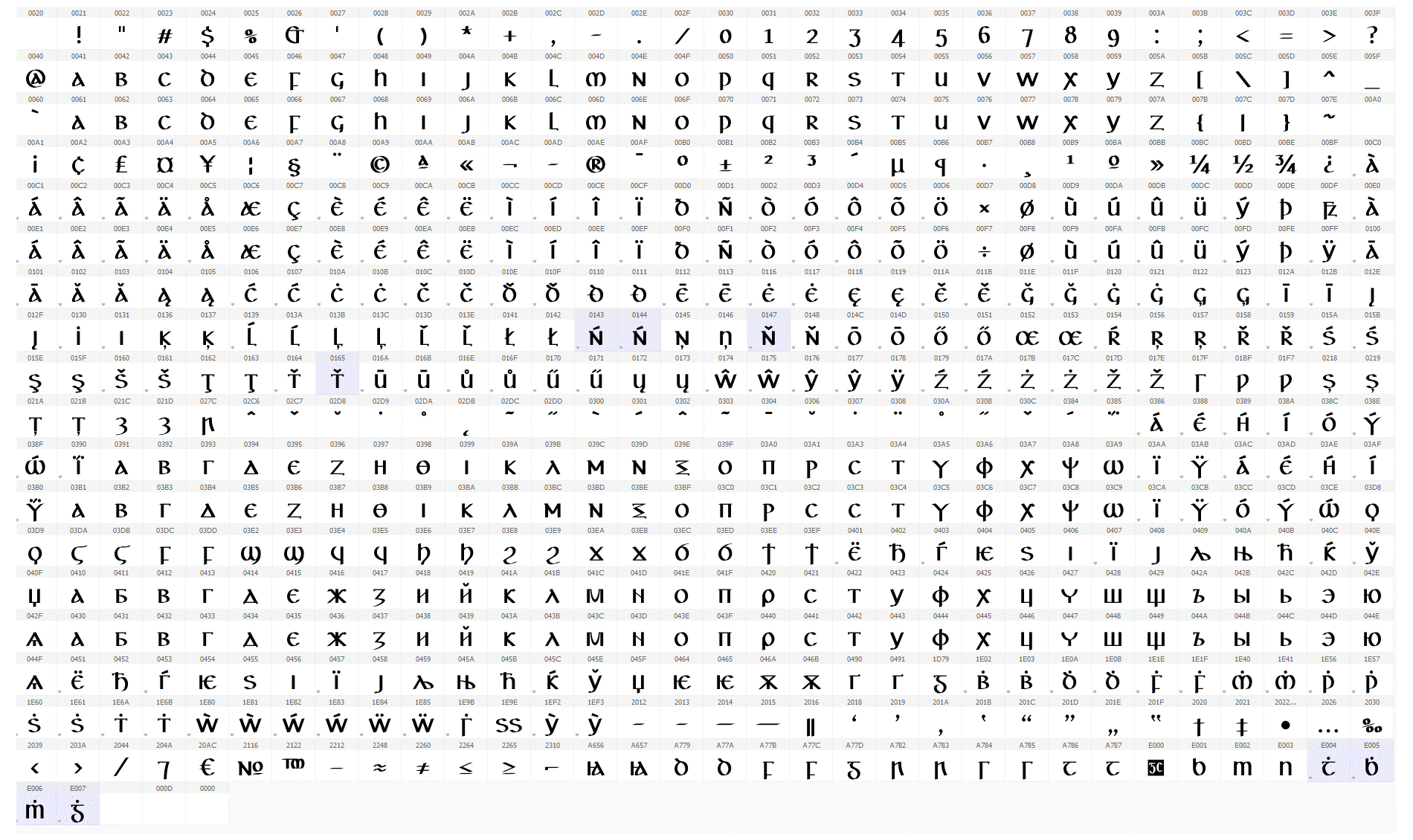 Tá Ardchló Eorpach GC códaithe de réir Unicode, an caighdeán idirnáisiúnta, agus tá na carachtair go léir sa chló léirithe anseo. Is féidir sampla de théacs a clóbhuaileadh leis an gcló seo a léamh má tá Acrobat Reader ar do ríomhaire agat.