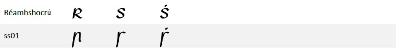 Tá na leaganacha inseacha de 'r' agus de 's' le fáil mar mhalairtí stíle (stylistic alternates) i leagan 1.00 den chló. Lena n‑úsáid, roghnaigh stylistic set 1: