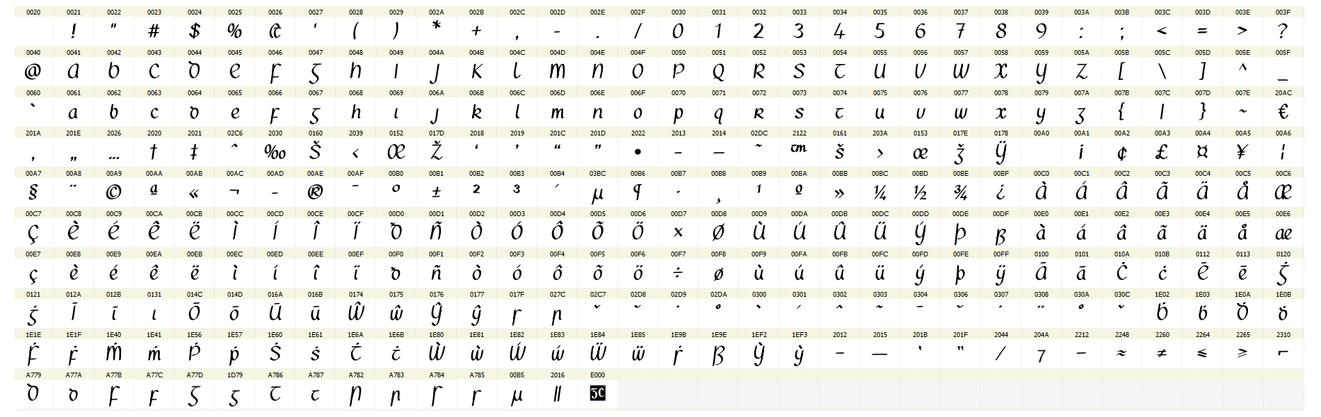 Tá Cuarchló GC códaithe de réir Unicode, an caighdeán idirnáisiúnta, agus tá na carachtair go léir ann léirithe anseo. Is féidir sampla de théacs a clóbhuaileadh leis an gcló seo a léamh má tá Acrobat Reader ar do ríomhaire agat.