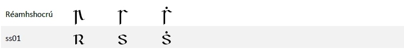 Tá leaganacha nua-aoiseacha de 'r' agus de 's' le fáil mar mhalairtí stíle (stylistic alternates) i leagan 2.00 den chló. Lena n‑úsáid, roghnaigh stylistic set 1: