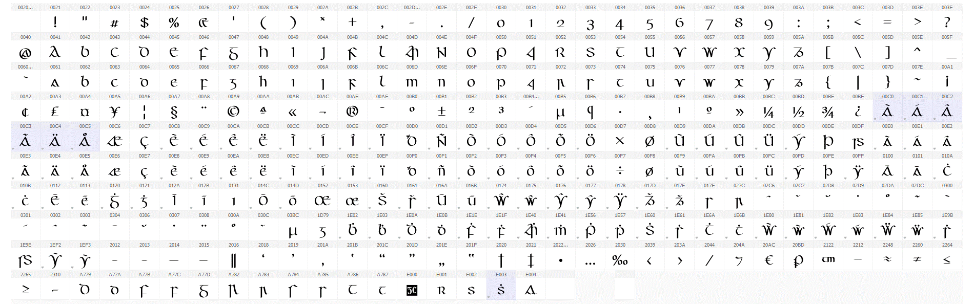 Tá an cló seo códaithe de réir Unicode, an caighdeán idirnáisiúnta, agus tá na carachtair go léir ann léirithe anseo. Is féidir sampla de théacs a clóbhuaileadh leis an gcló seo a léamh má tá Acrobat Reader ar do ríomhaire agat.