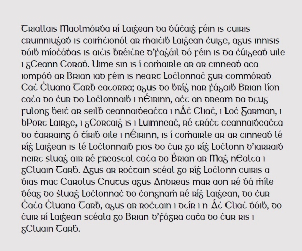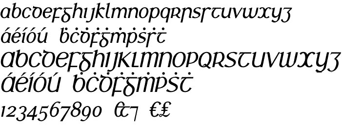 Tá an cló seo códaithe de réir Unicode, an caighdeán idirnáisiúnta, agus tá na carachtair go léir ann léirithe anseo. Is féidir sampla de théacs a clóbhuaileadh leis an gcló seo a léamh má tá Acrobat Reader ar do ríomhaire agat.