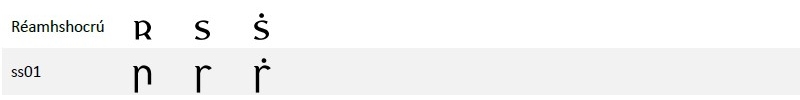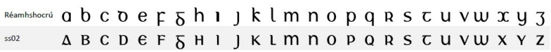Tá na leaganacha inseacha de 'r' agus de 's' le fáil mar mhalairtí stíle (stylistic alternates). Lena n‑úsáid, roghnaigh stylistic set 1: