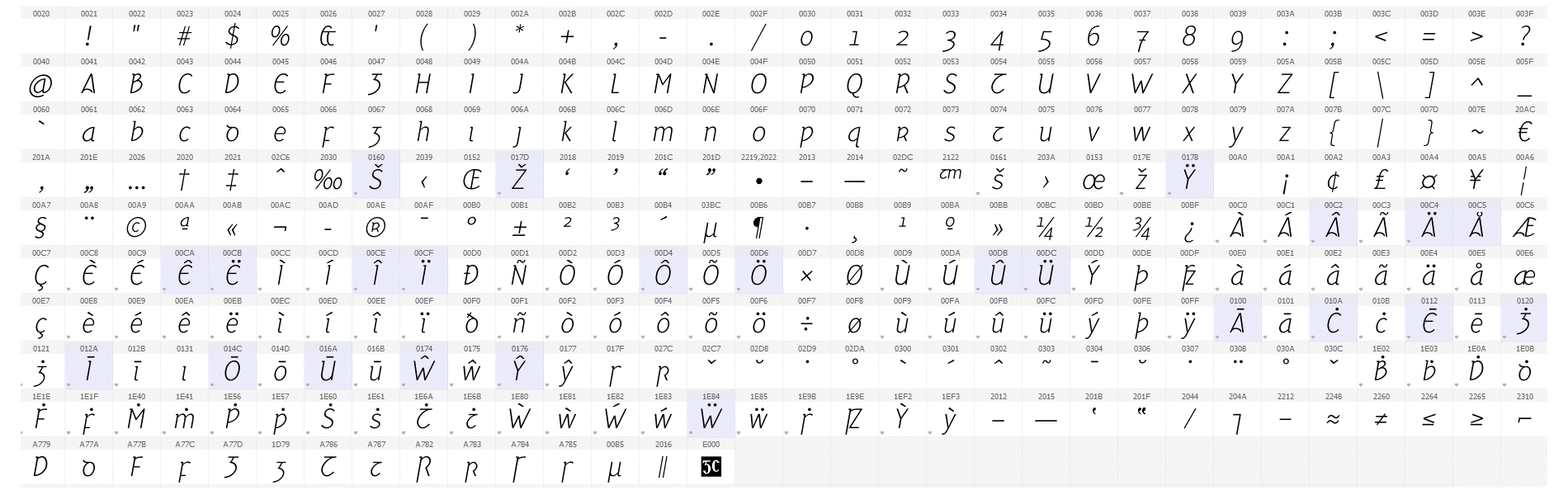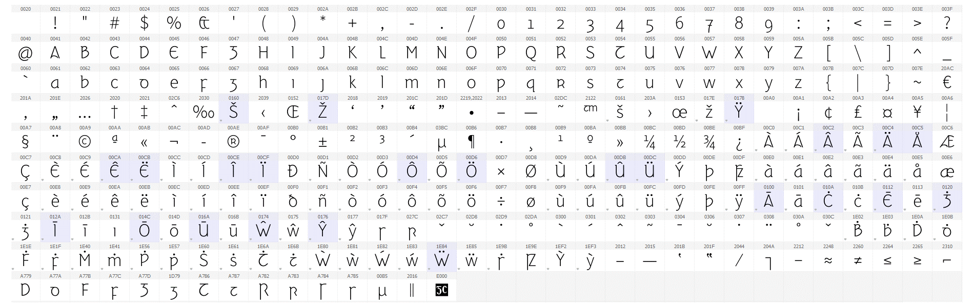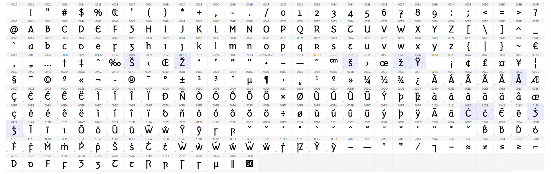 Tá an cló seo códaithe de réir Unicode, an caighdeán idirnáisiúnta, agus tá na carachtair go léir ann léirithe anseo. Is féidir sampla de théacs a clóbhuaileadh leis an gcló seo a léamh má tá Acrobat Reader ar do ríomhaire agat.