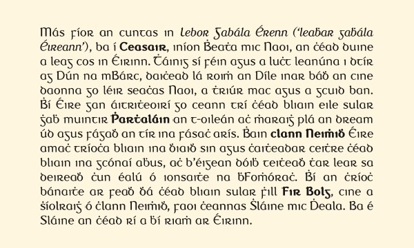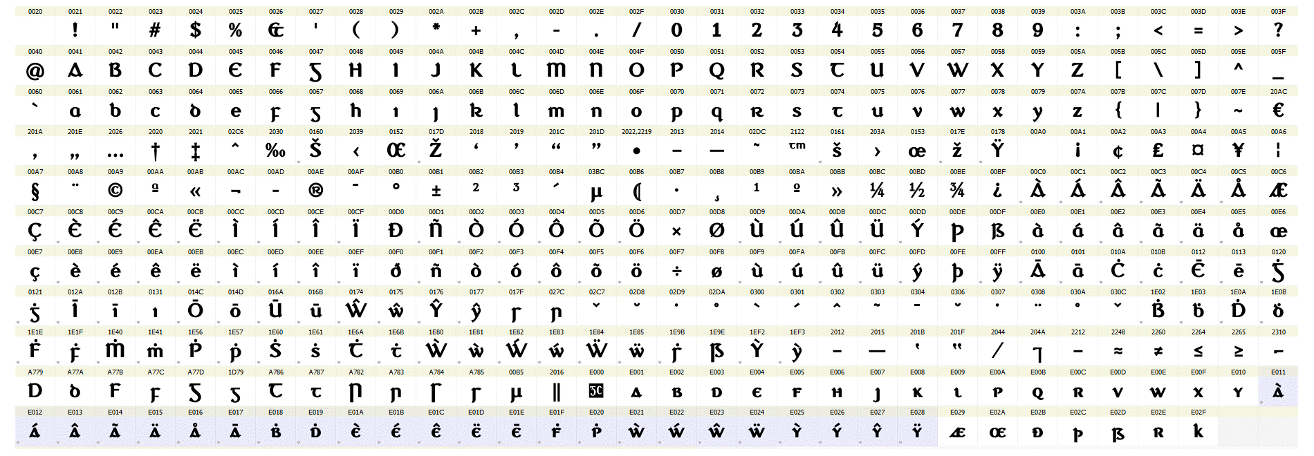 Tá an cló seo códaithe de réir Unicode, an caighdeán idirnáisiúnta, agus tá na carachtair go léir ann léirithe anseo. Is féidir sampla de théacs a clóbhuaileadh leis an gcló seo a léamh má tá Acrobat Reader ar do ríomhaire agat.