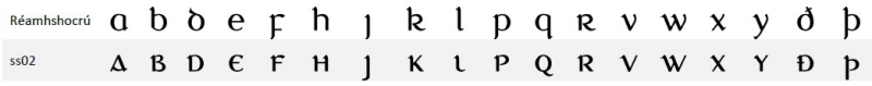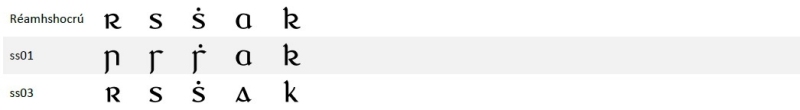 Tá roinnt malairtí stíle (stylistic alternates) le fáil i leagan 8.00 den chló in éineacht leis an stíl réamhshocraithe. Lena n‑úsáid, roghnaigh tacar stíle uimhir a haon (ss01) nó uimhir a trí (ss03). Gheofar na leaganacha inseacha de 'r' agus de 's' in ss01, agus tá leaganacha malartacha de na litreacha 'a', 'k' agus 'r' in ss03 mar a léirítear thíos: