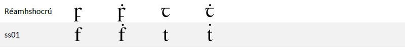 Tá dhá fhoirm éagsúla de 'f séimhithe' agus de 't séimhithe' le fáil i leagan 3.00 den chló mar mhalairtí stíle (stylistic alternates). Chun teacht ar na foirmeacha éagsúla, roghnaigh stylistic set 1: