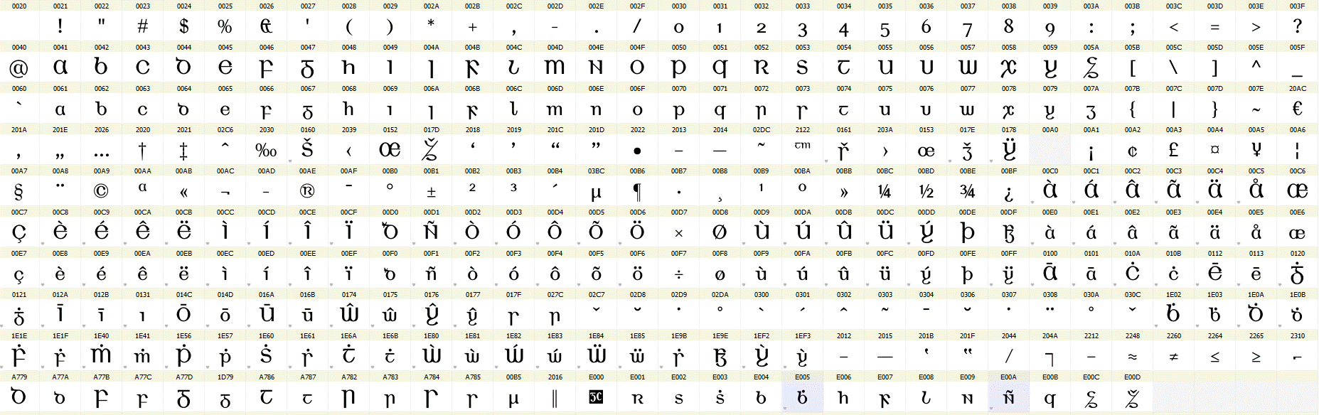 Tá Ríchló GC códaithe de réir Unicode, an caighdeán idirnáisiúnta, agus tá na carachtair go léir ann léirithe anseo. Is féidir sampla de théacs a clóbhuaileadh leis an gcló seo a léamh má tá Acrobat Reader ar do ríomhaire agat.
