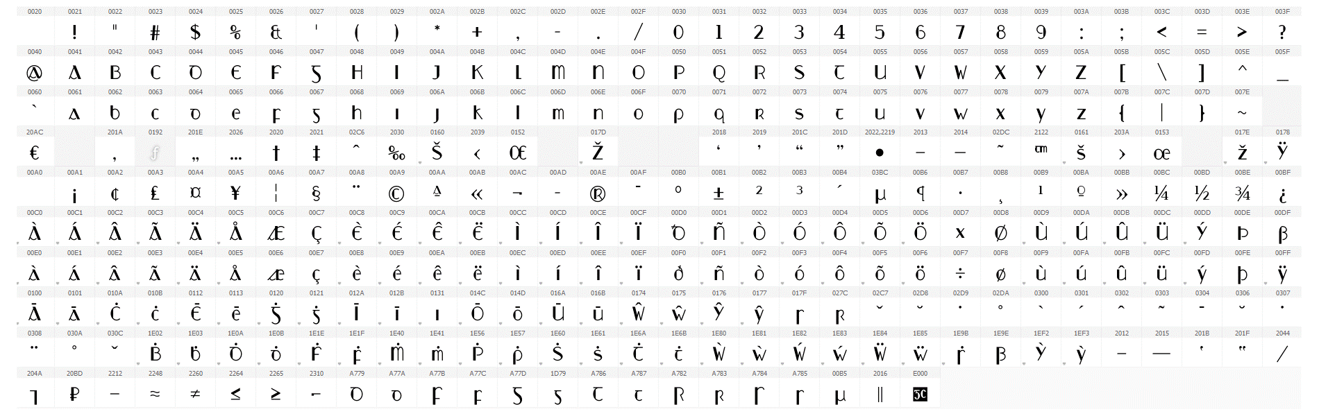 Tá Slimchló GC códaithe de réir Unicode, an caighdeán idirnáisiúnta, agus tá na carachtair go léir ann léirithe anseo. Is féidir sampla de théacs a clóbhuaileadh leis an gcló seo a léamh má tá Acrobat Reader ar do ríomhaire agat.