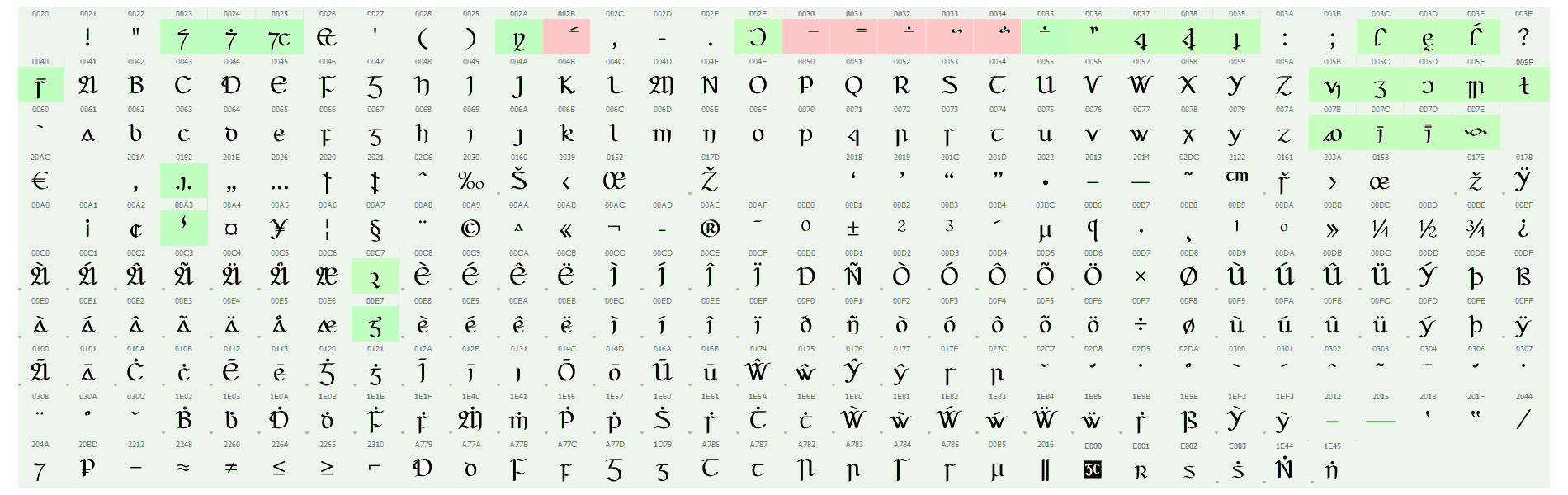 Níl an cló seo códaithe de réir Unicode toisc go bhfuil na noda is coitianta ó ré na lámhscríbhinní - noda nach bhfuil códuimhreacha acu in Unicode - le fáil in áiteanna a cuireadh in áirithe do charachtair eile sa chaighdeán idirnáisiúnta. Tá na carachtair go léir in Seanchló na Nod GC léirithe ar an tábla seo. Is noda iad na carachtair atá i mboscaí a bhfuil dath glas nó dath dearg orthu; tabhair faoi deara gur os cionn na litreacha a thagann go díreach ar a lorg a scríobhtar na noda sna boscaí dearga.