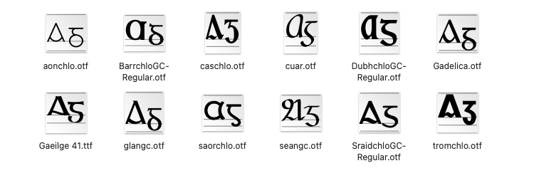 Thíos: mar a léirítear Bunchló sa Font Book a dháiltear le 'Monterey' (macOS 12.0).